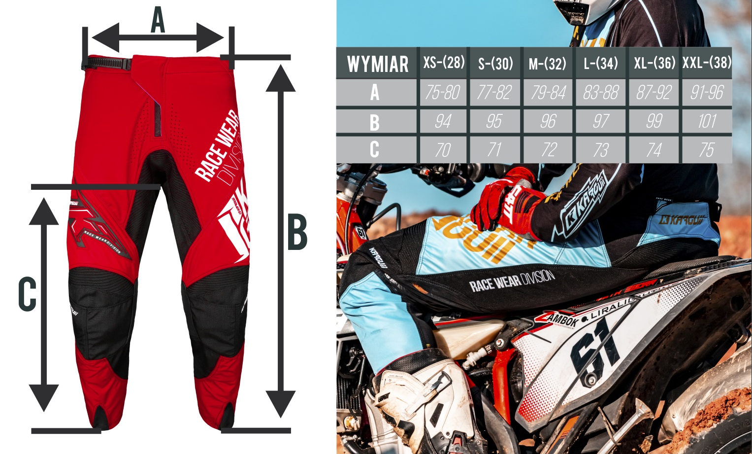 Zaprojektowane przez nas spodnie MX to istny przełom w kwestii komfortu podróży na quadach. Są one kompromisem miedzy wygodą a wytrzymałością. Użyte przez nas materiały zapewniają elastyczność w miejscach, gdzie jest potrzebna, oraz wytrzymałość w miejscach narażonych na extremalne tarcie. Użycie specjalnej skóry na wewnętrznej części kolan sprawia że, trzymanie motocykla nogami staje się prostsze. Dodatkowa regulacja w pasie pomaga w precyzyjnym dopasowaniu spodni do ciała. Zadbaliśmy również o, odpowiednią wentylacje, poprzez umieszczenie wlotów powietrza w górnej części spodni. Grafika nanoszona metodą sublimacji, gwarantuje bardzo wysoką wytrzymałość druku oraz nieograniczone możliwości. Uzyskanie idealnego kroju spodni poprzedzone jest kilkoma latami testów i wieloma prototypami.